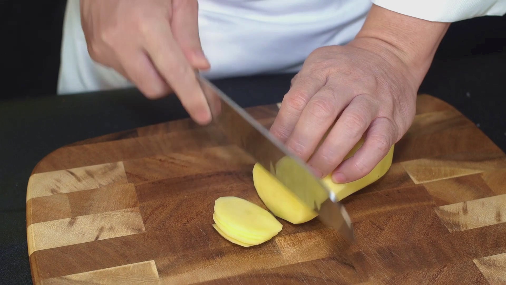 Vår mest använda multikniv i köket. Santoku-bladet är tunt för finare, kontrollerade snitt och har urfräsningar (granton) som minskar att råvaror fastnar när du hackar. Perfekt för skiva, hacka och tärna – från grönsaker till kött och fisk.